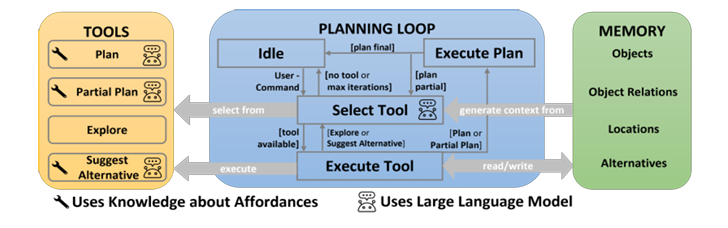 3. <mark style="color:blue;">**Affordance-based Planning:**</mark> The Plan and Partial Plan tools use the LLM to generate goal states in an affordance-based planning domain and create a plan to fulfill the (partial) goal using a classical planner.
