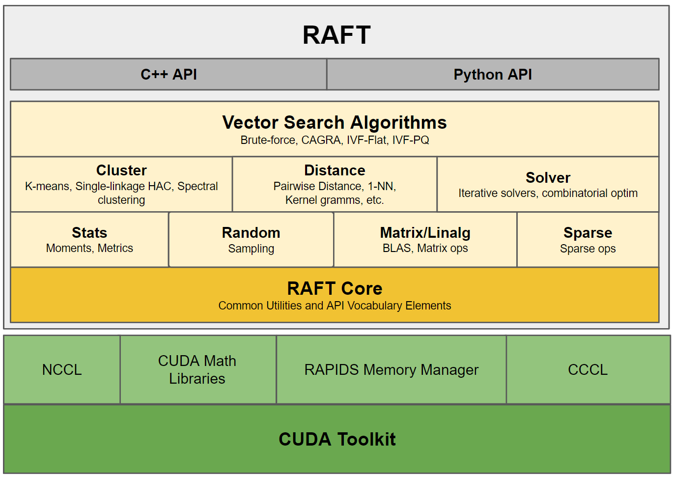 RAFT provides a consistent experience across different levels of the stack, from a header-only C++ template library to a shared library with precompiled template specialisations and a Python API (PyLibRAFT).